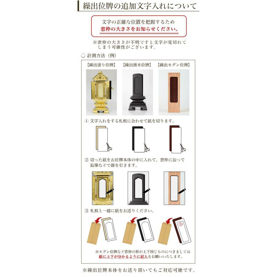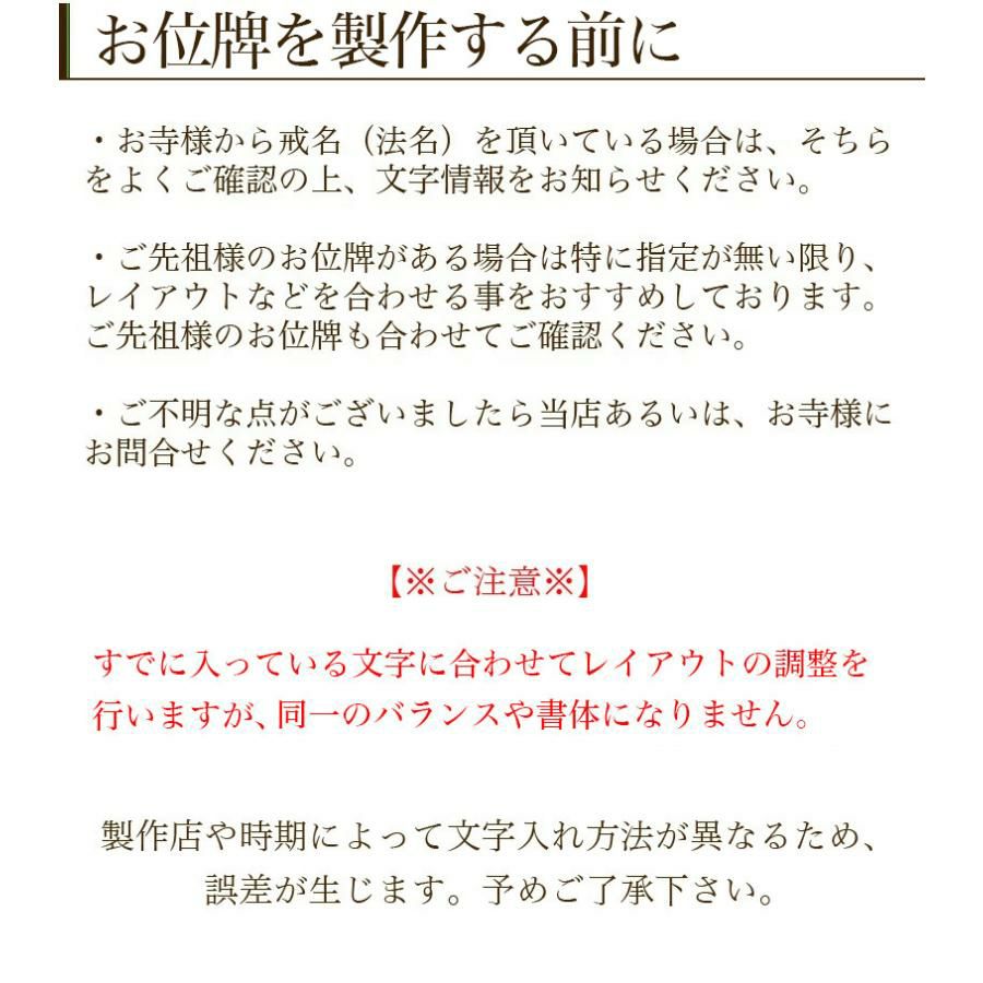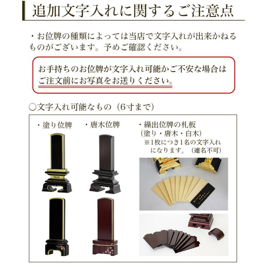 他の画像を見る お持ちのお位牌、札板に追加文字入れをご希望の方 位牌 追加文字入れ/札板 黒塗 繰出し位牌 モダン位牌 塗り位牌 文字 仏壇 名入れ 価格 ¥ 5,000 税込 詳細を見る お気に入りに登録する (0)